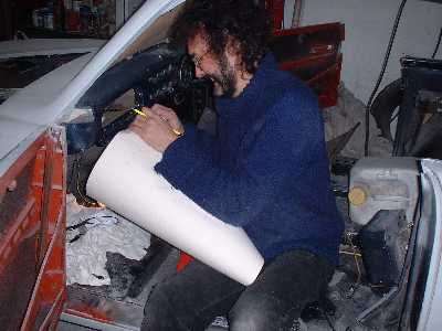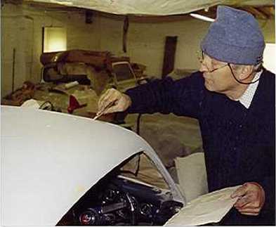 Pat Locker at work on his Farina (E1 SA 109R), literally putting on a finishing touch prior to its respray. This would be very early in 2003 when the completed car took to the road again |